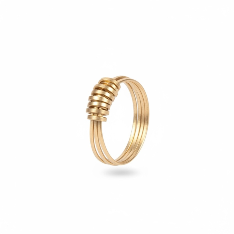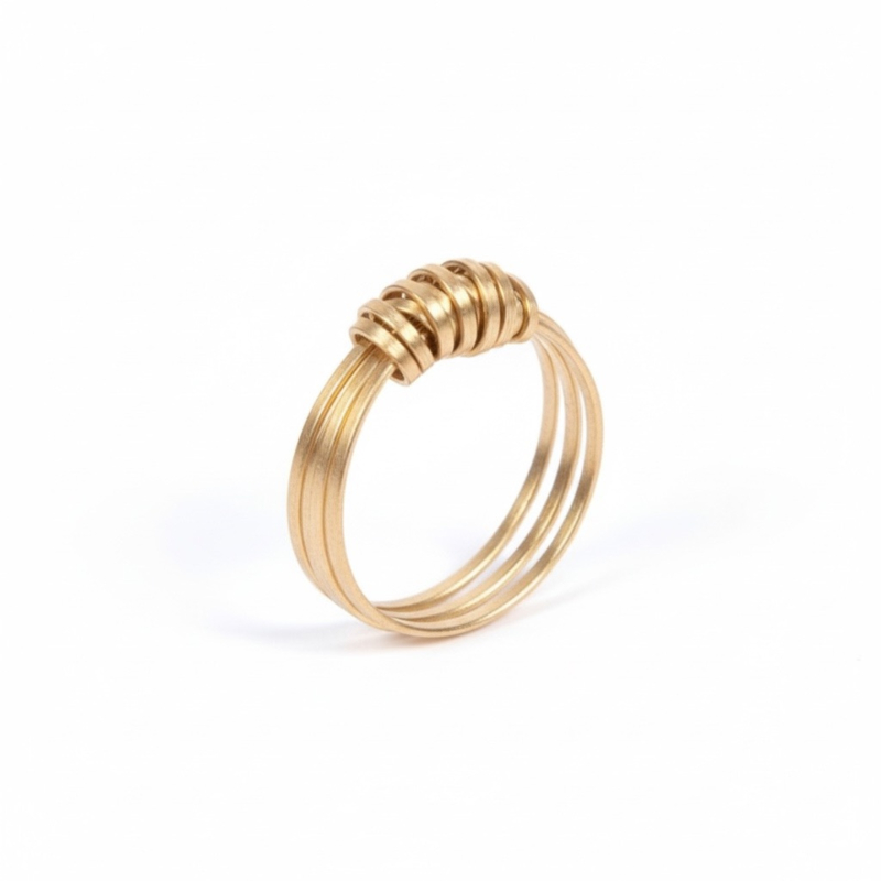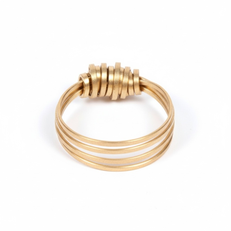 Artikelnummer: ZB1608-18Zes subtiele smalle strookjes gesneden uit messing platen worden opgerold en gedraaid en vormen deze prachtige ring.