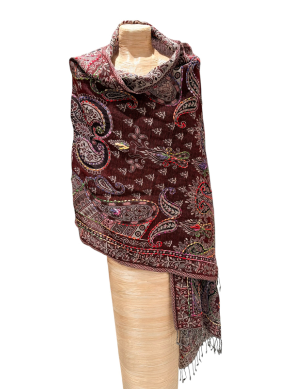 Prachtige geborduurde omslagdoek/sjaal met mooie gedraaide stevige franje, met de hand geborduurd door vrouwen in Nepal. Door de afmeting niet alleen als sjaal maar ook als omslagdoek te dragen. Afmeting: 190 x 72 cm - zonder…