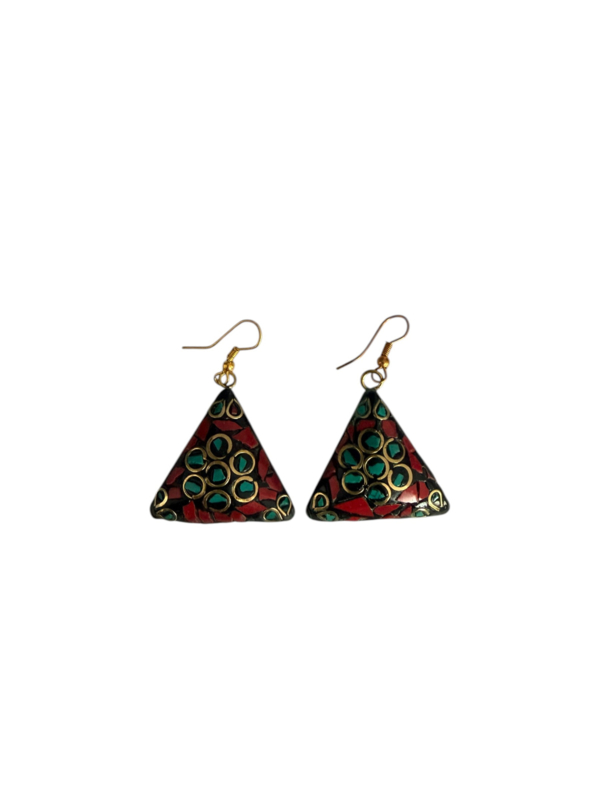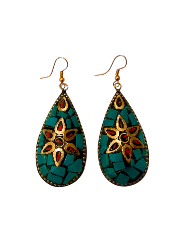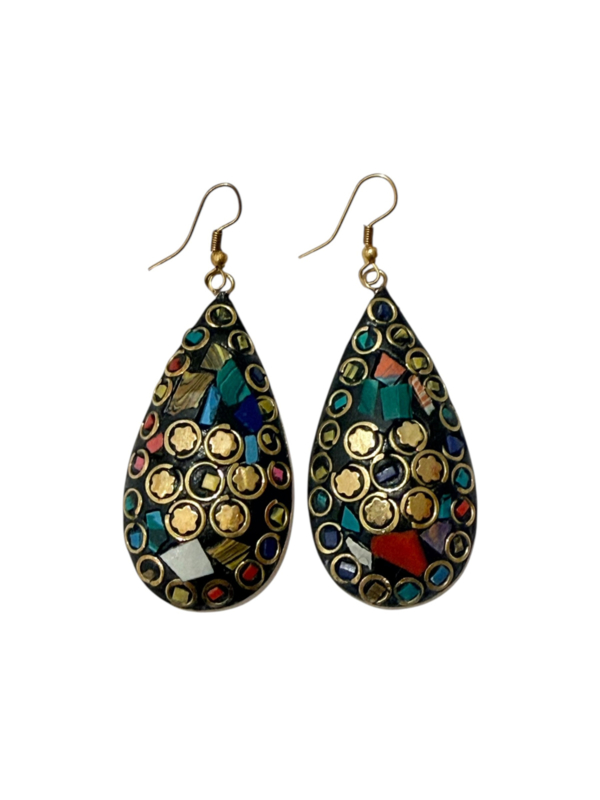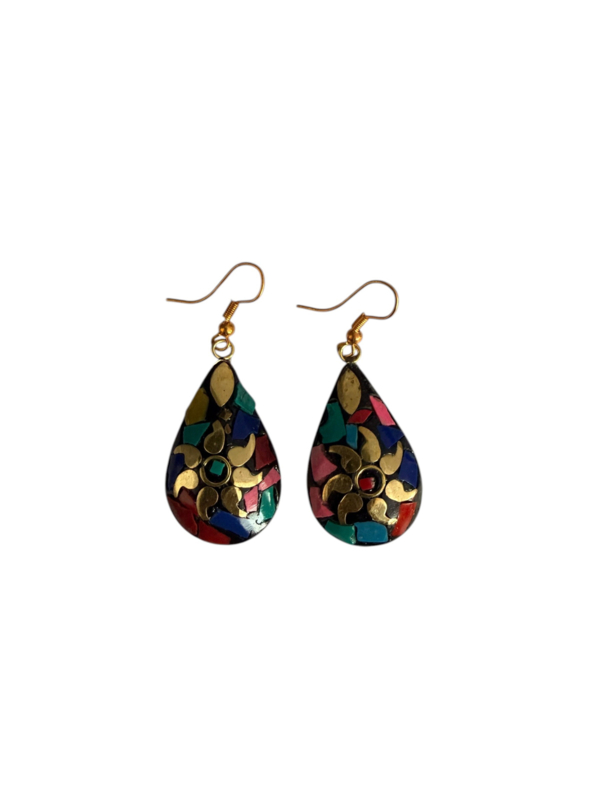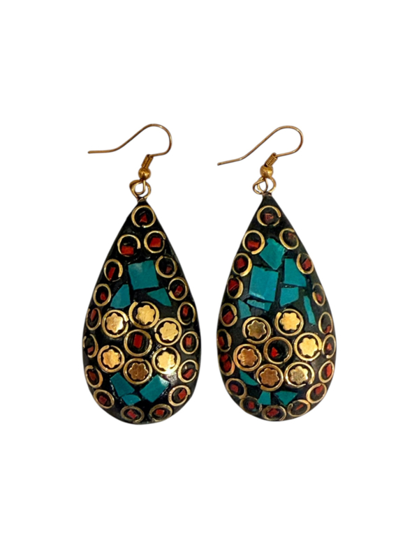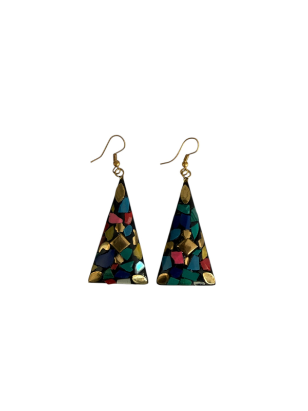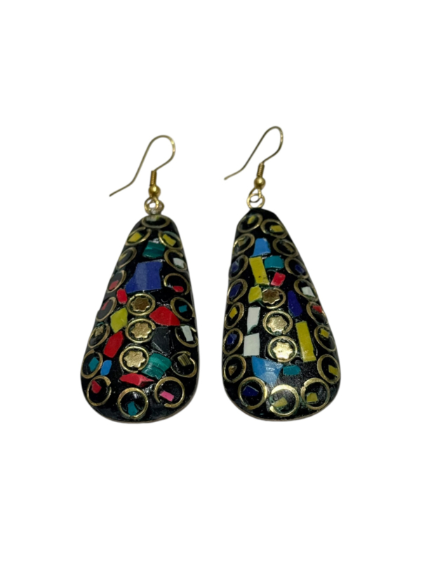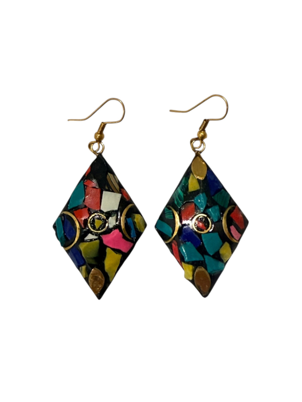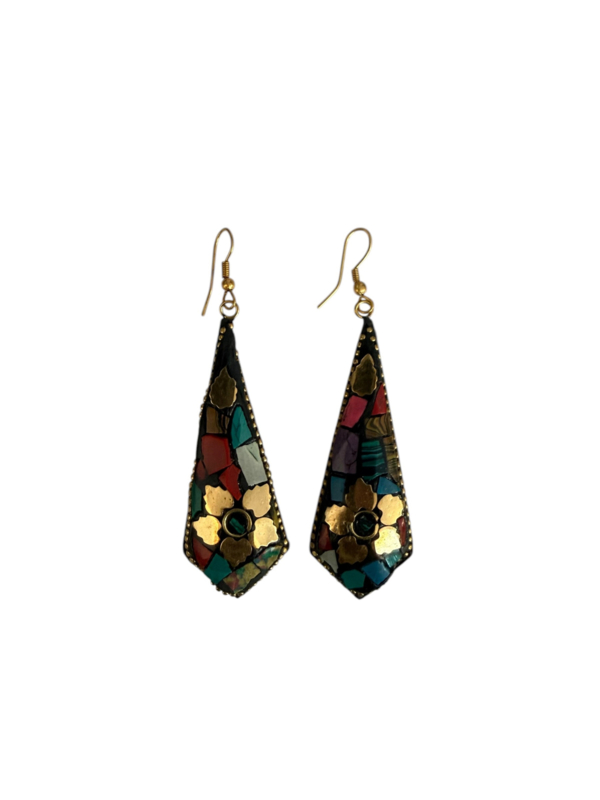 - Oorbellen gemaakt van messing, aan de voorzijde gecombineerd met gekleurde steentjes. Die zijn gemaakt van verpulverde steen die naderhand gekleurd wordt en in mozaïek design wordt ingelegd in de hanger in combinatie met stukjes messing, waardoor er een prachtig ontwerp ontstaat.