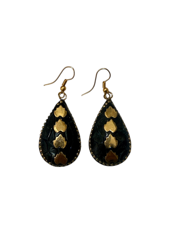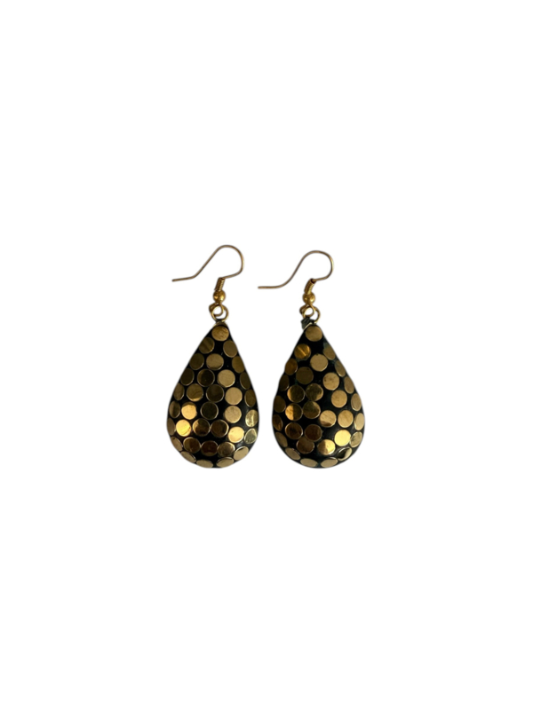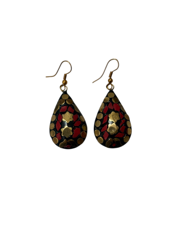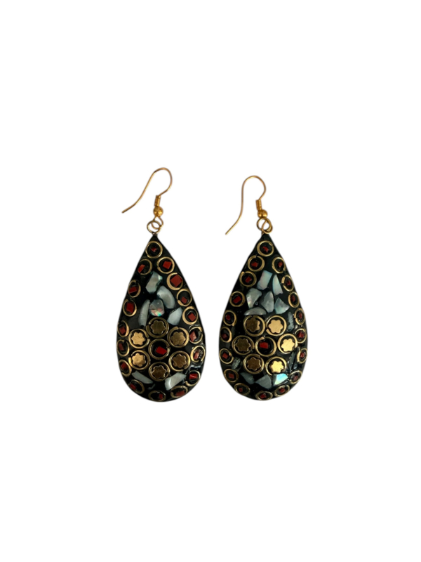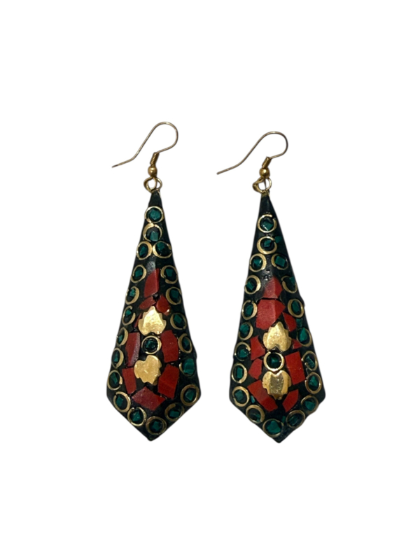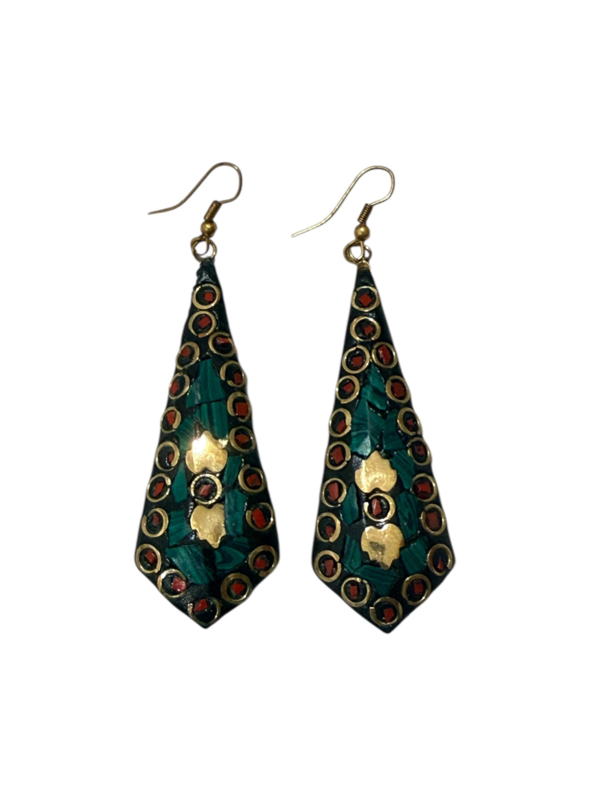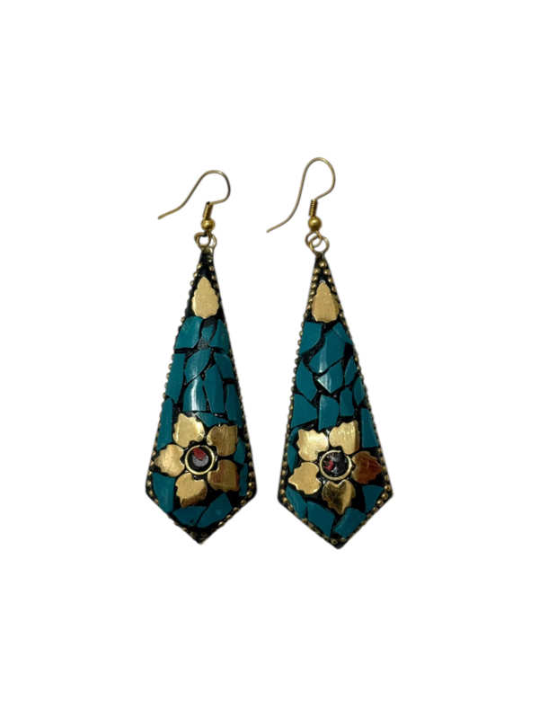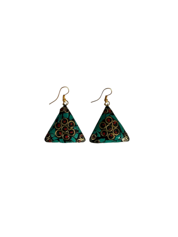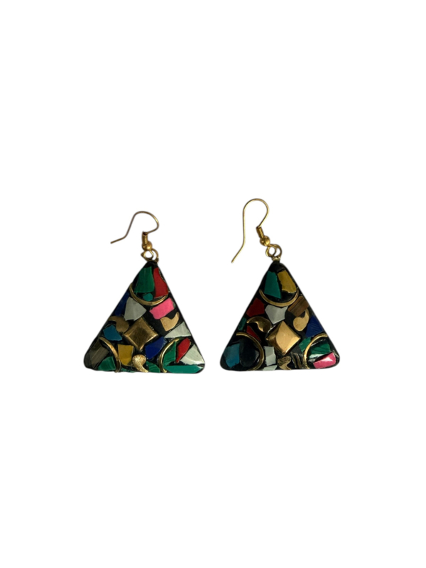- Oorbellen gemaakt van messing, aan de voorzijde gecombineerd met gekleurde steentjes. Die zijn gemaakt van verpulverde steen die naderhand gekleurd wordt en in mozaïek design wordt ingelegd in de hanger in combinatie met stukjes messing, waardoor er een prachtig ontwerp ontstaat.